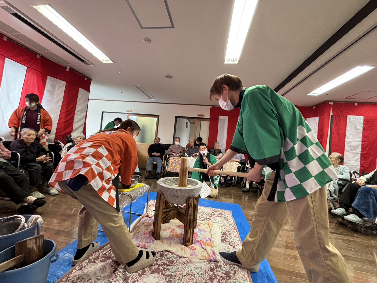大雪の中にも関わらずご家族様にも参加して頂き、楽しく餅つきを行うことができました。昼食時には、つきたてのお餅を召し上がり、ご利用者にも喜んで頂けたと思います。
